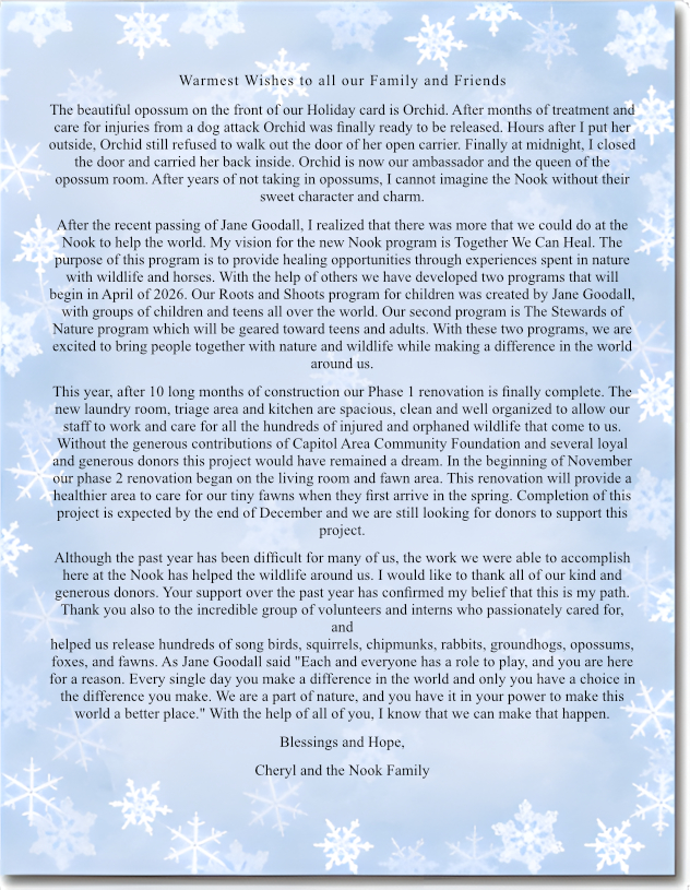 Nottingham Nature Nook is both a wildlife rehabilitation center and nature sanctuary in East Lansing, MI. At our rehabilitation center we provide care for wildlife babies and injured adults. At our sanctuary, we foster learning and healing opportunities for people with both horses and wildlife.